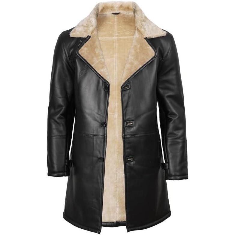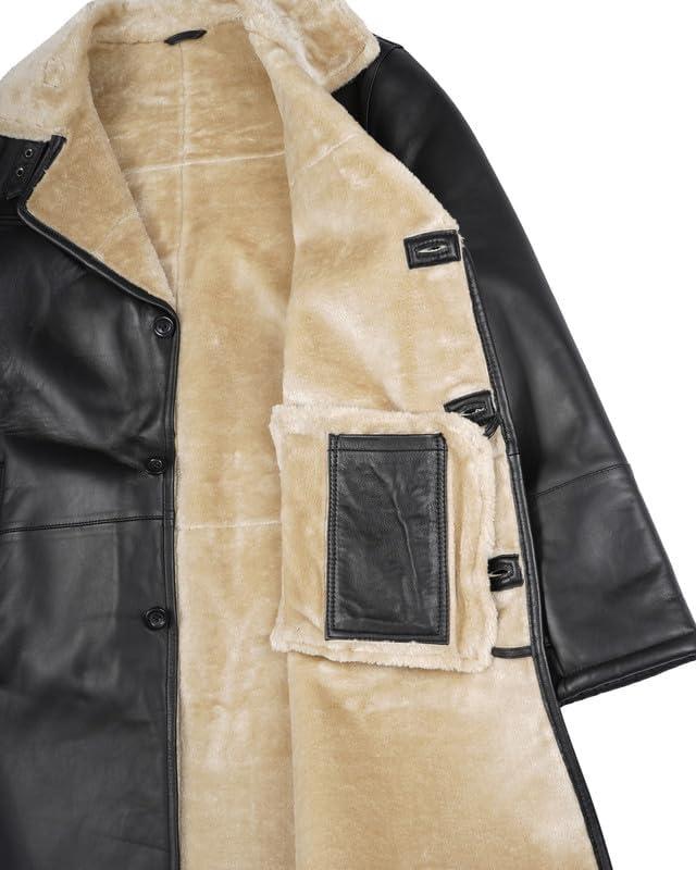 Blingsoul Black Car Coat Men – Winter Shearling Long Leather Jackets For Men(Black/Beige – Turlock Shearling Coat)