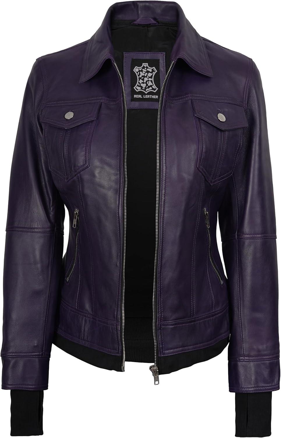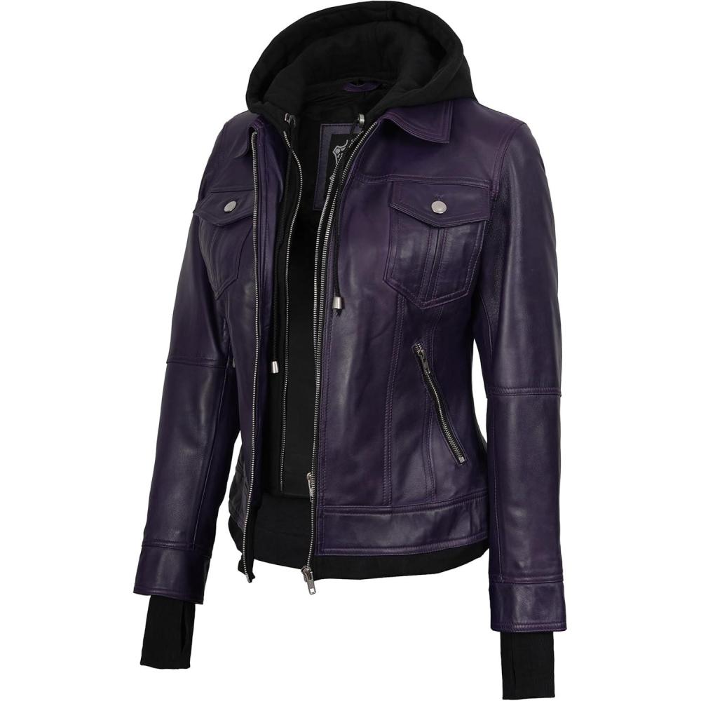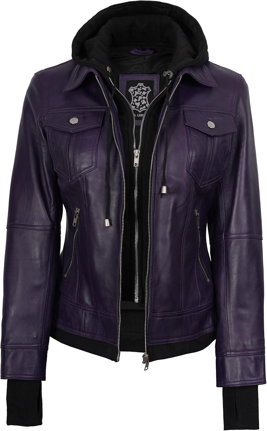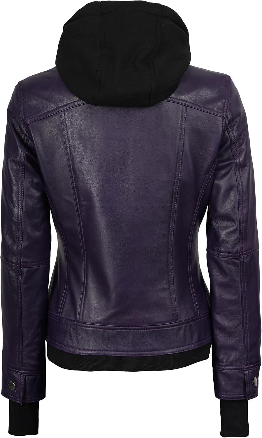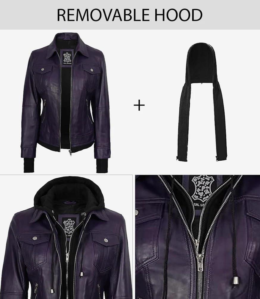 Blingsoul Leather Bomber Jacket Women - Real Lambskin Womens Leather Jackets with Detachable Hood(Purple - Betty Jacket)