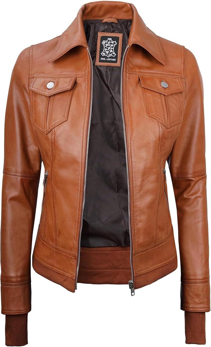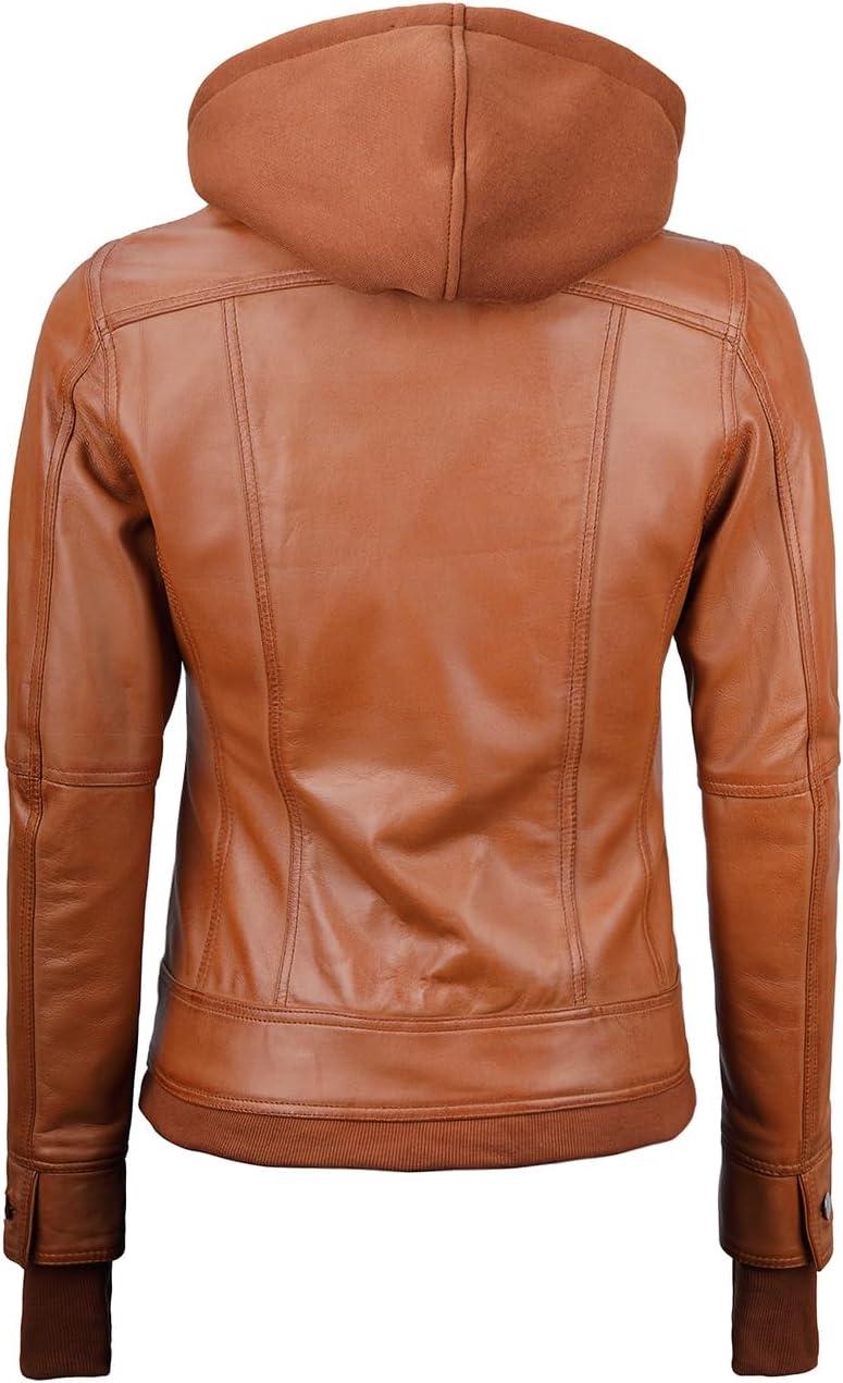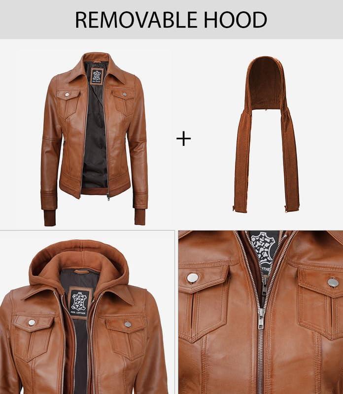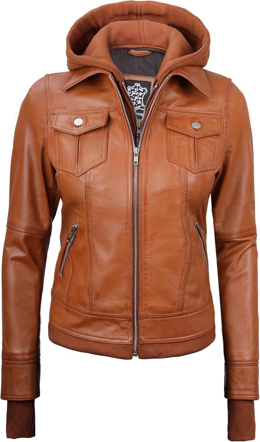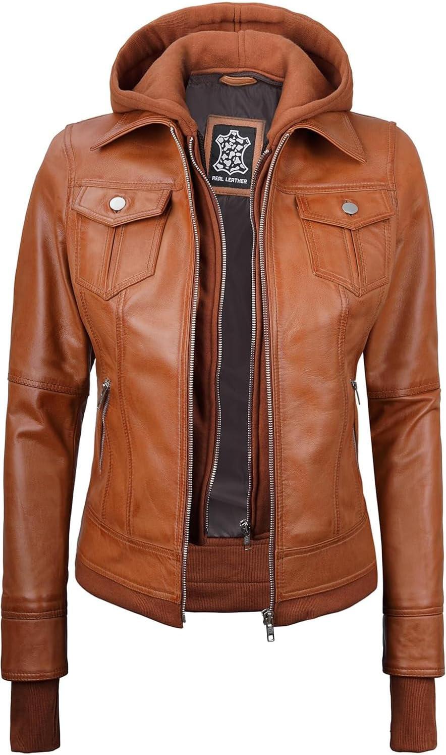 Blingsoul Leather Bomber Jacket Women – Real Lambskin Womens Leather Jackets with Removable Hood(Cognac – Tralee Jacket)