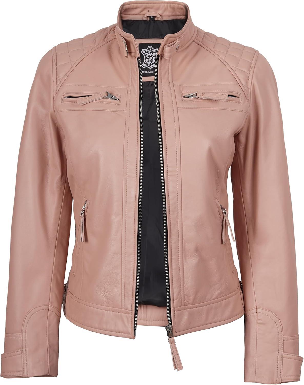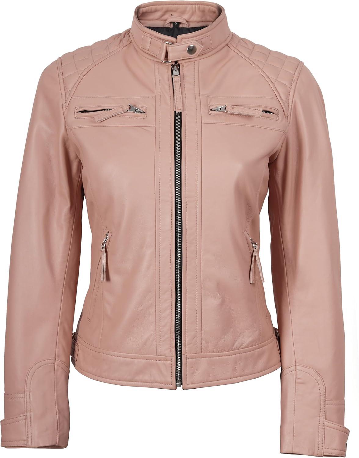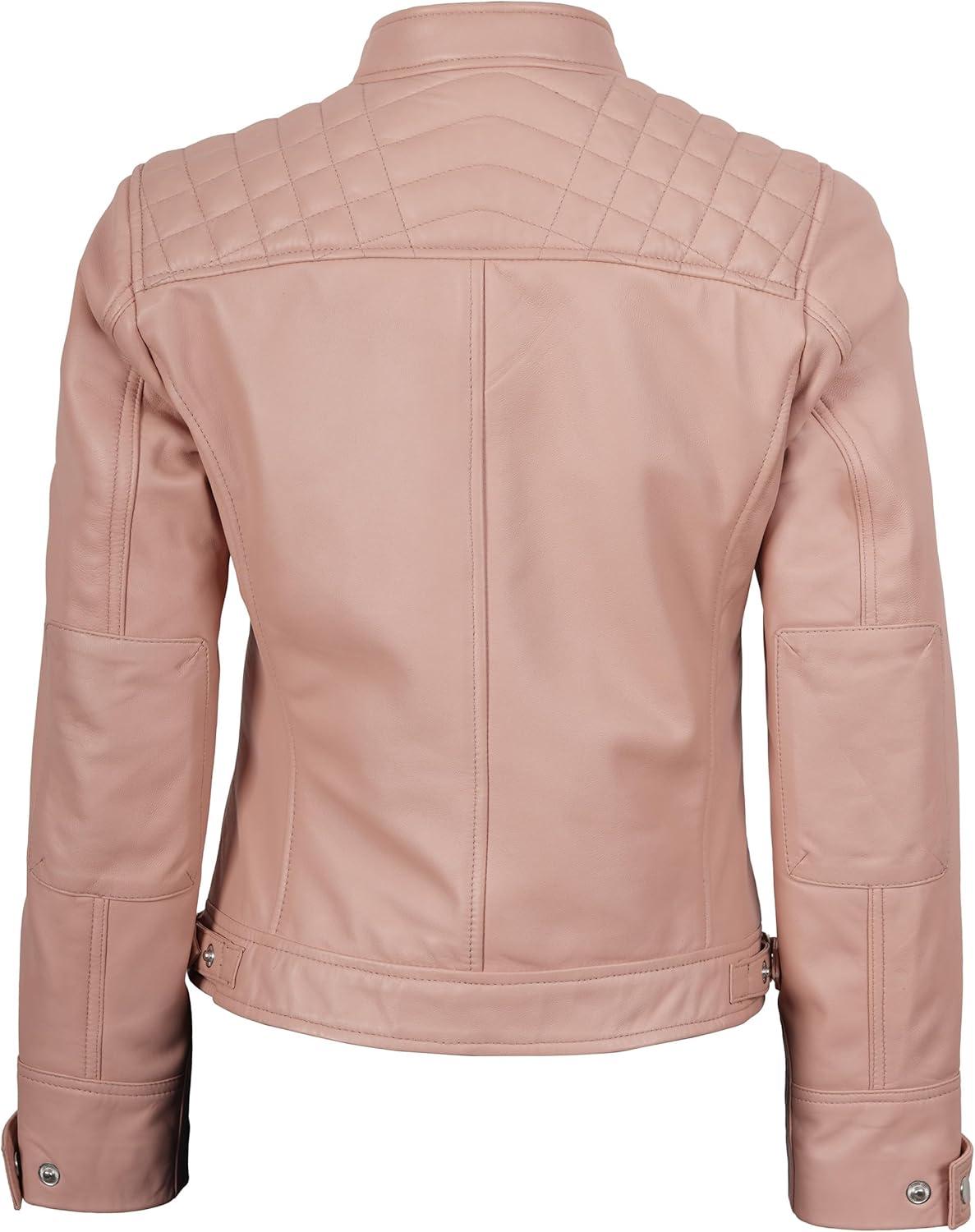 Blingsoul Leather Jacket Women - Quilted Cafe Racer Style Womens Leather Jackets(D1 - Pink Jacket)