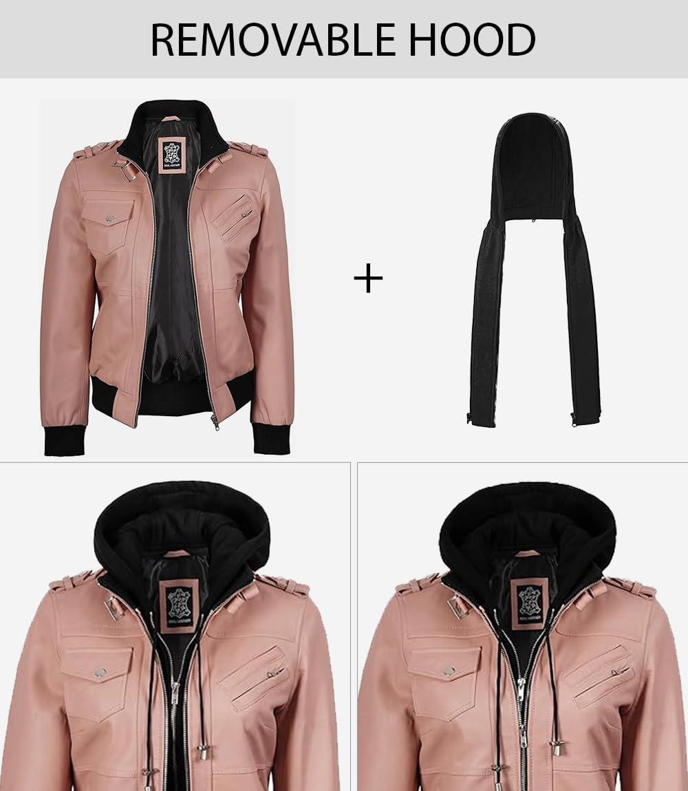 Blingsoul Leather Jacket Women – Real Lambskin Womens Leather Jackets With Detachable Hood(Edinburgh – Pink Jacket)