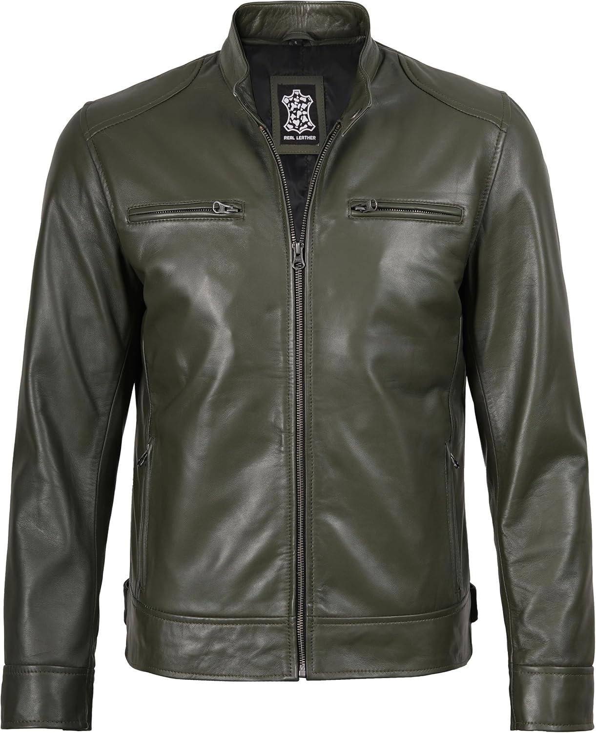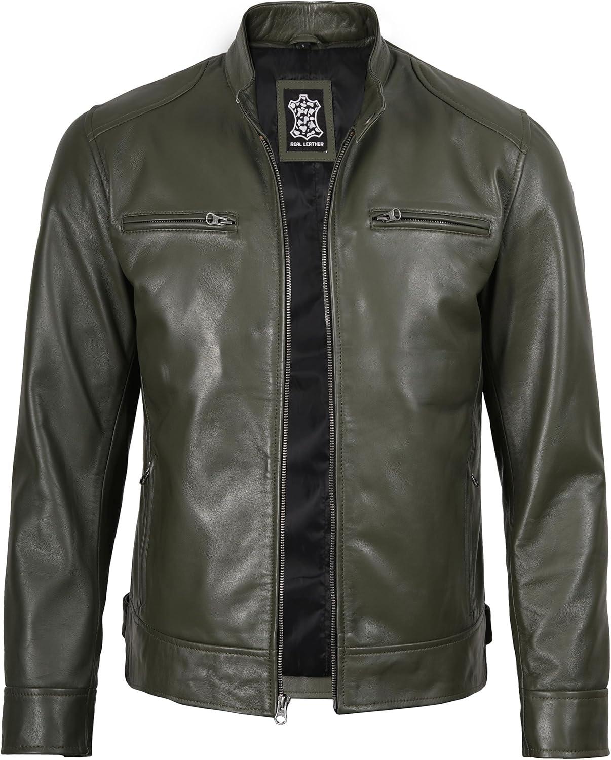 Blingsoul Leather Jackets For Men - Real Lambskin Motorcycle Style Mens Leather Jacket(Dodge - Olive Green Jacket)