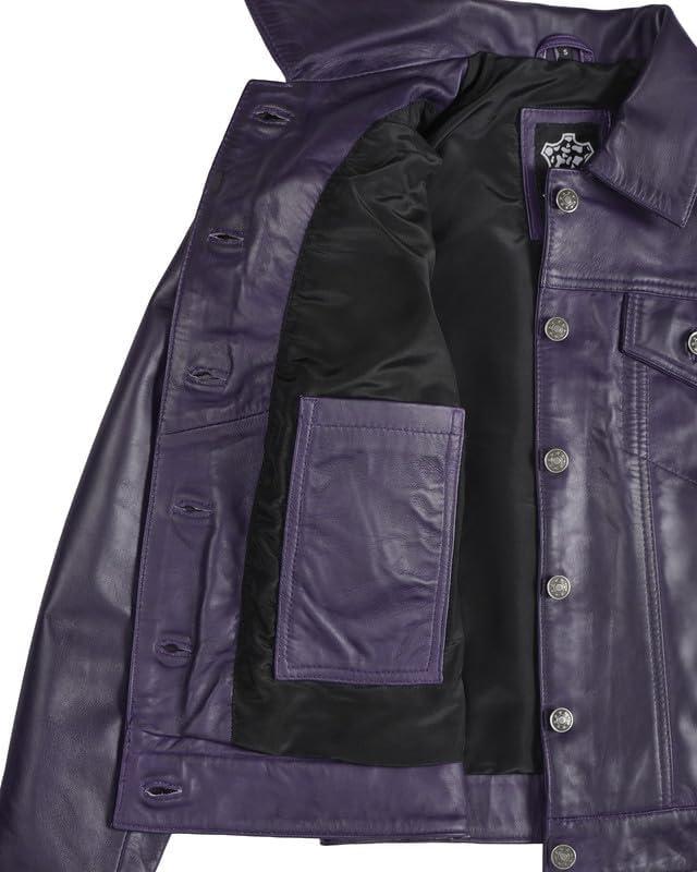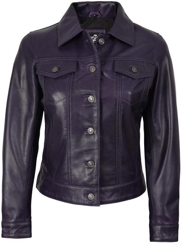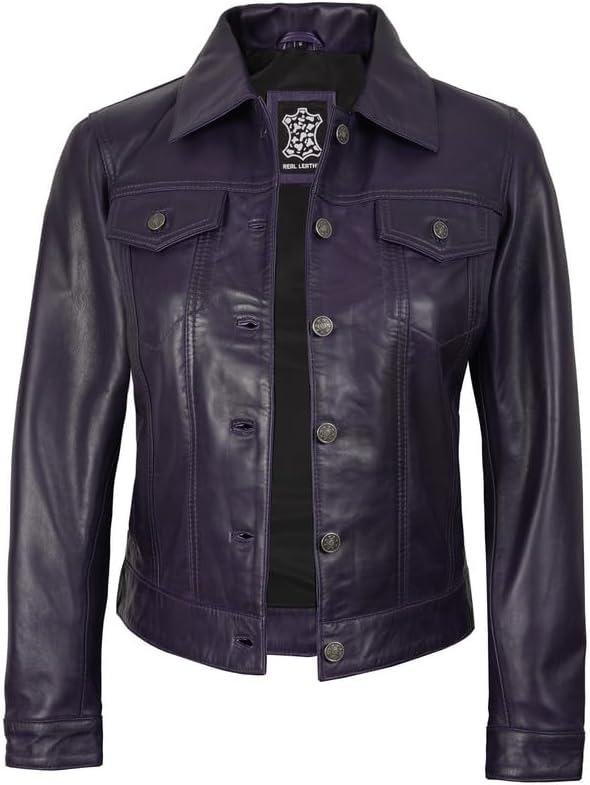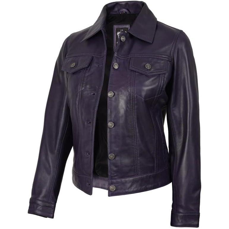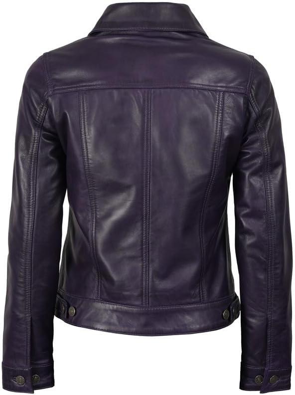 Blingsoul Real Lambskin Leather Jacket for Women, Shirt Collar Leather Jacket Womens(Fernando Trucker - Purple Wax Jacket)