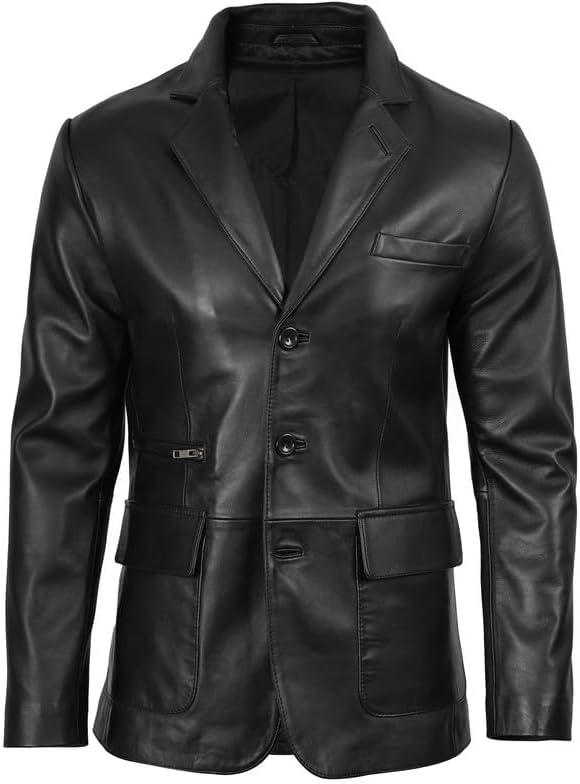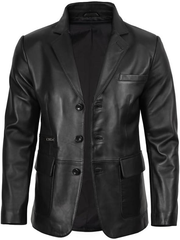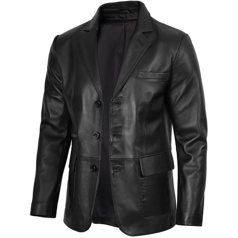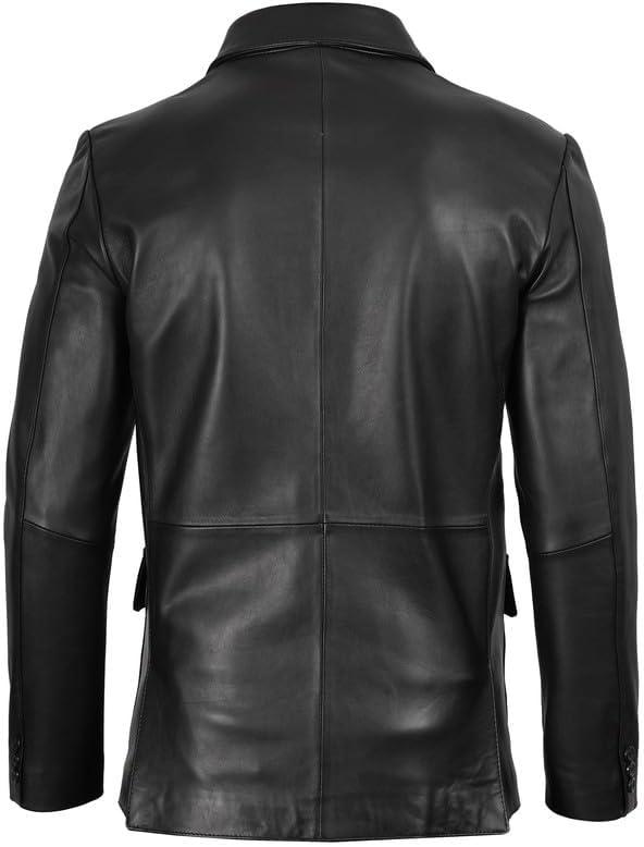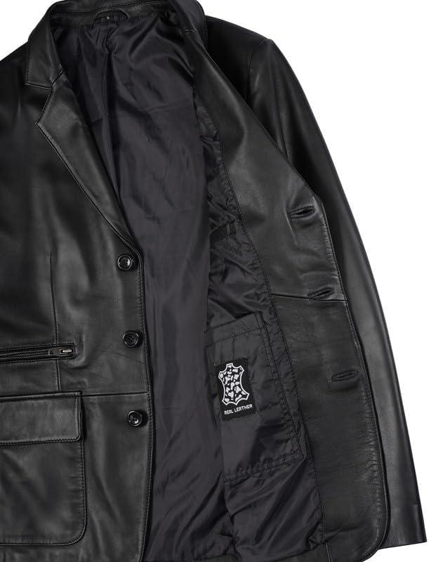 Blingsoul Real Lambskin Mens Leather Blazer - Casual 2 Buttons Leather Jacket for Men(Black - 3-button Leather Blazer)