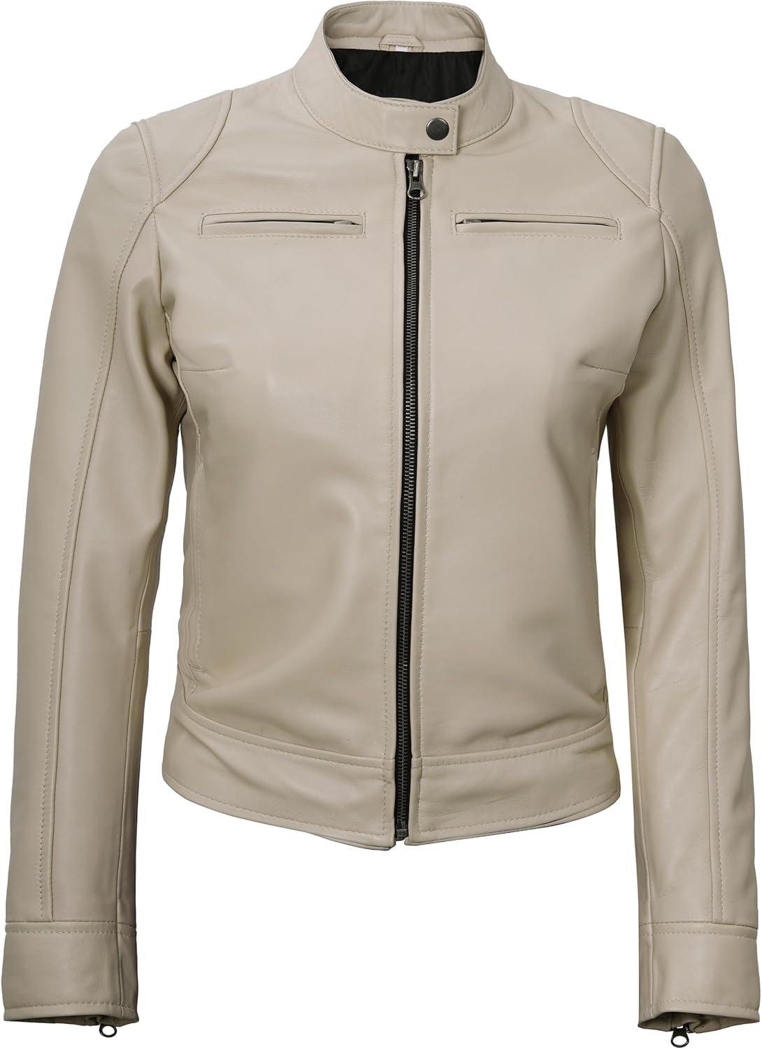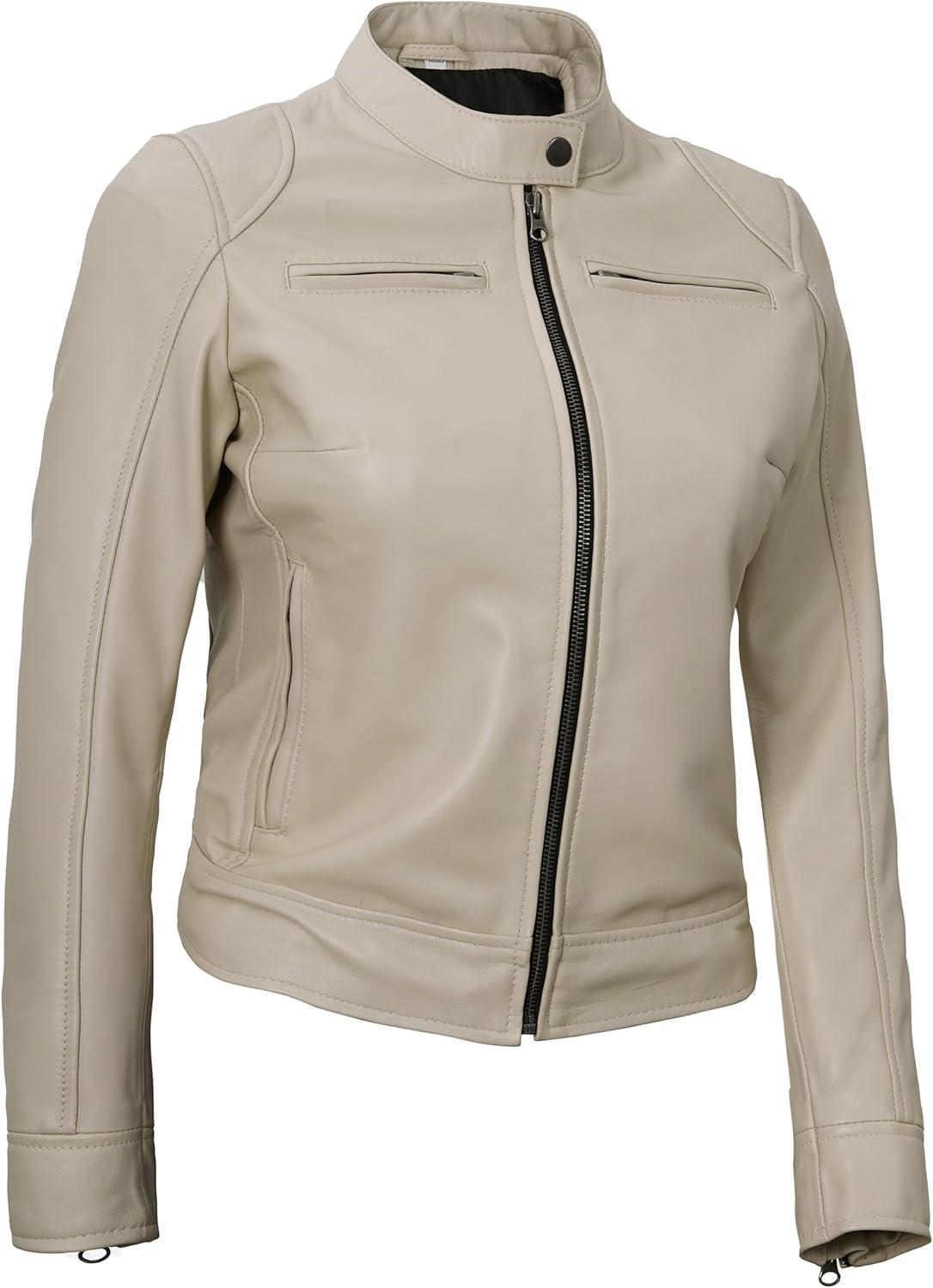 Blingsoul Real Leather Jacket Women - Cafe Racer Style Womens Leather Jackets(Dodge - Beige Jacket)