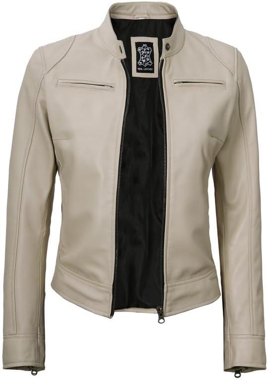 imageBlingsoul Real Leather Jacket Women  Cafe Racer Style Womens Leather JacketsDodge  Beige Jacket