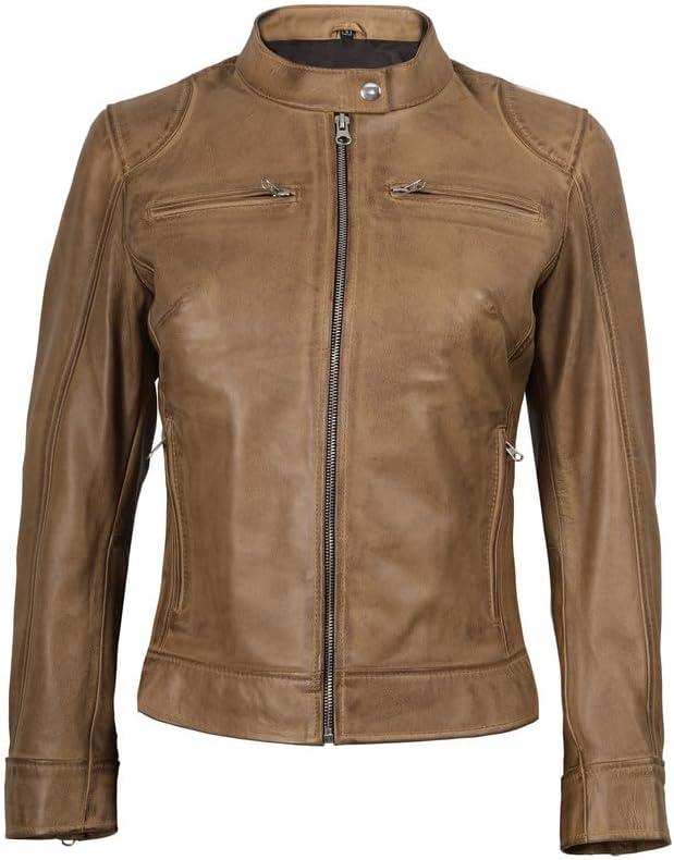 Blingsoul Real Leather Jacket Women - Cafe Racer Style Womens Leather Jackets(Dodge - Camel Jacket)