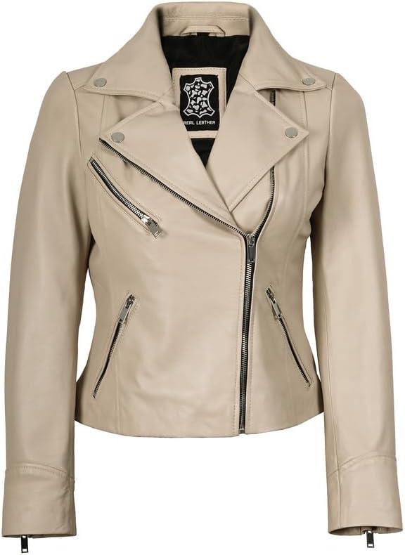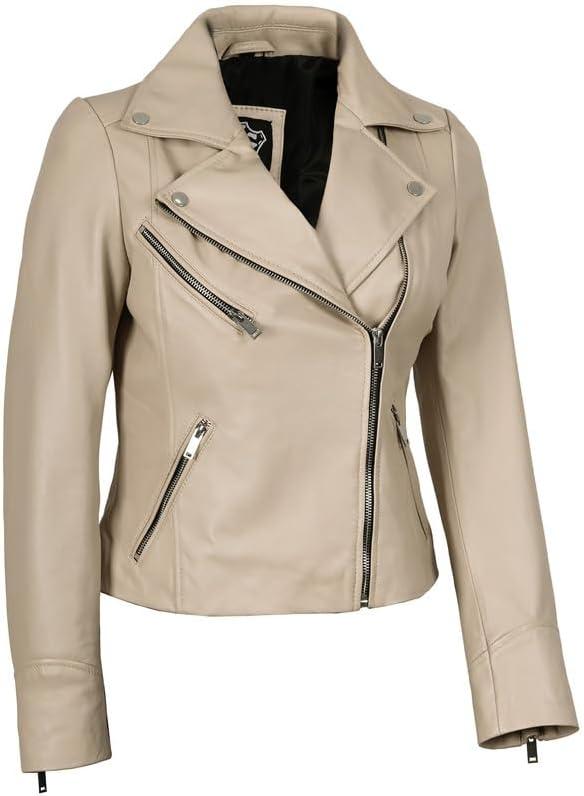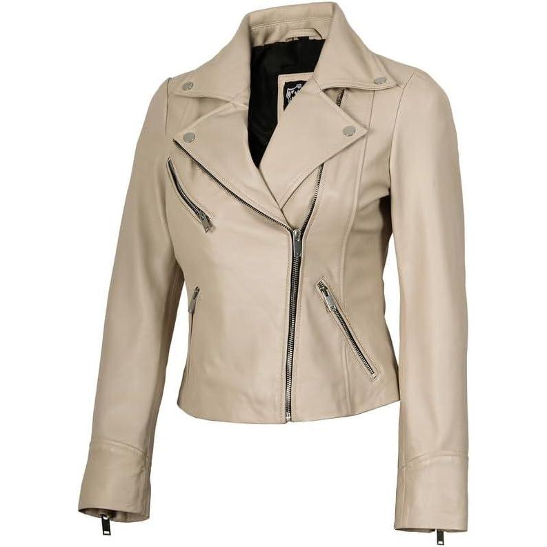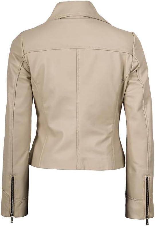 Blingsoul Womens Real Leather Jacket - Asymmetrical Leather Jackets for Women(Ninfa - Beige Jacket)